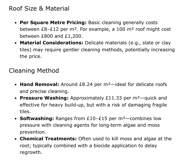 - £900 for soft washing @ £12 per sq.m. inc. algae prevention treatment